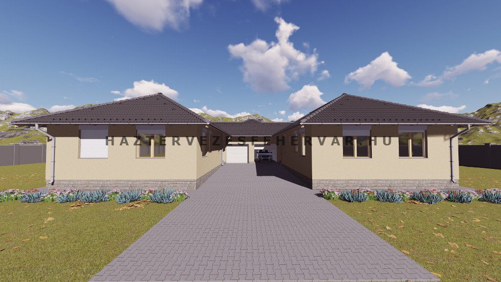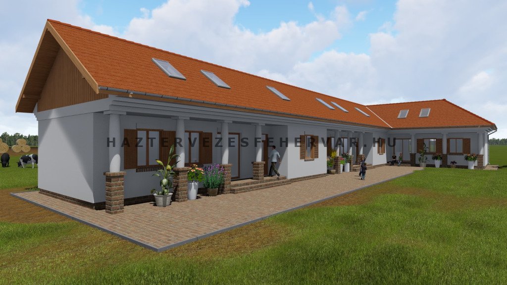 Három egyforma alapterületű lakás parasztház stílusú társasházban.